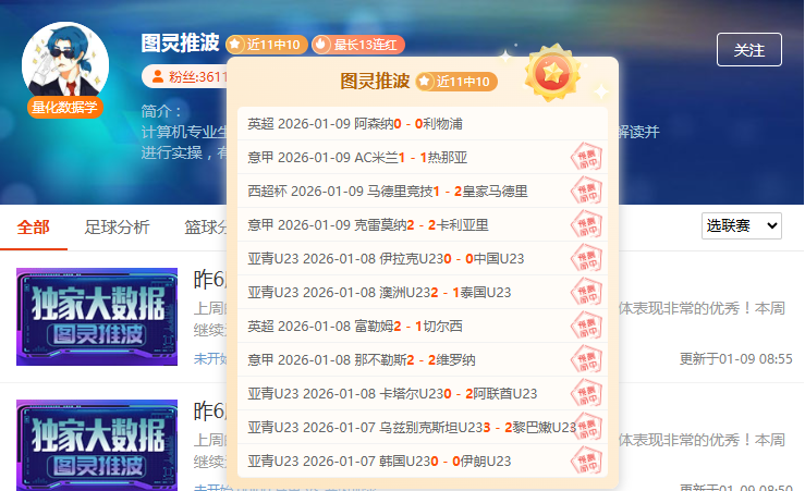 这是一位将专业背景与赛事分析完美结合的典范。计算机专业出身的“图灵推波”,擅长运用大数据模型进行实操解析,其推荐逻辑严密,精准度极高。近期11场命中10场的恐怖表现,已接近理论极限,充分证明了其独家数据模型的强大威力,是理性派和技术流用户的首选。