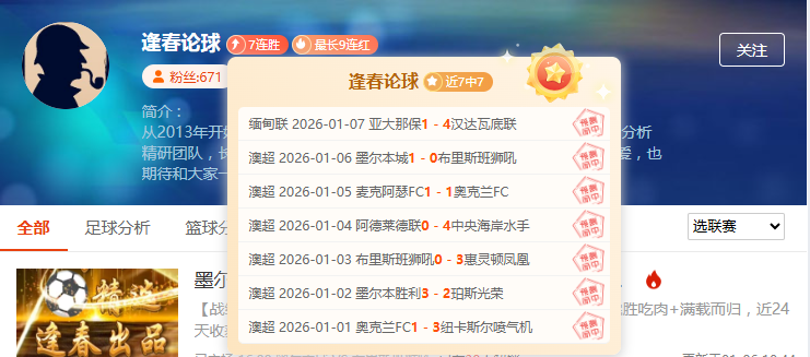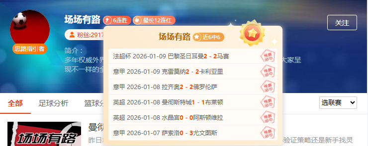 名为“场场有路”,实则为用户探寻每场比赛的清晰路径。这位拥有多年权威分析经验的作者,以稳健著称,目前正以6连胜的步伐持续提供可靠指引。其分析视角全面,善于为不同需求的用户(无论是验证策略还是寻找灵感)提供明确参考,是值得信赖的场外导航。