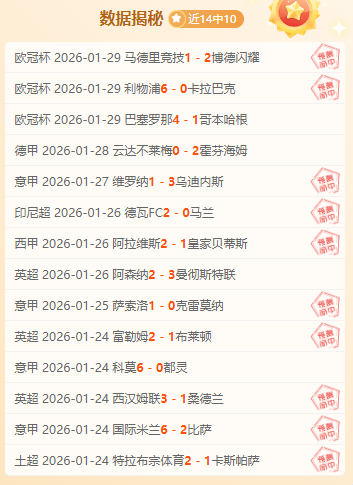昨日双胜,近期成绩14胜10。祝大家生活如足球赛场般精彩,好运相伴,胜利连连!数据揭秘保持长胜心态,看到的朋友不要再犹豫了。