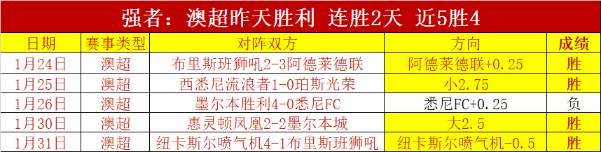 澳超昨胜,连胜2天,近5胜4十分出色。昨天继续胜利,连胜4天,近21胜13,目前状态好,加上周末赛事更出色。过去三个月(10月、11月和12月)保持正向胜+月成绩,三个月胜+33,月成绩非常精彩