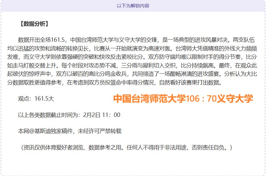 【成绩回顾】昨2胜!中台大联二场全胜!精选比赛拆解本期再创连胜新高度,篮球方向连胜呈现非同凡响,拆解精准比赛继续收获连胜,篮球板块拆解数据勇往直前,资深篮球爱好者,用独立方式拆解赛事再为大家奉上。以下再为大家分享一场精彩赛事,敬请期待!