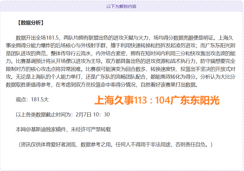 【成绩回顾】昨2胜!昨CBA杯、中台女篮获胜!精选比赛拆解本期再创连胜新高度,篮球方向连胜呈现非同凡响,拆解精准比赛继续收获连胜,篮球板块拆解数据勇往直前,资深篮球爱好者,用独立方式拆解赛事再为大家奉上。以下再为大家分享一场精彩赛事,敬请期待!