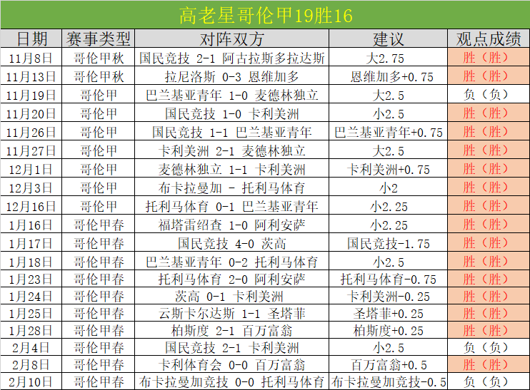 哥伦甲19胜16,美洲长期处于精彩状态发挥状态。二月过去10天胜7天,累计胜+6,二月发挥出色