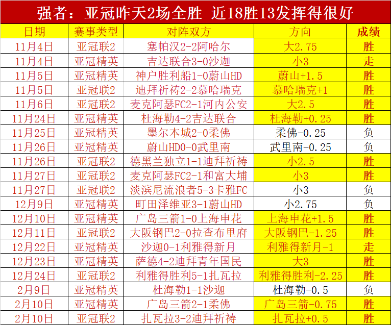 亚冠昨天全胜,近18胜13成绩发挥得很好。连续两天取得6胜4胜利,连胜4天,近23胜16,当前状态非常出色值得信赖
