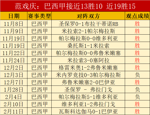 巴西甲19胜15,长达5个月时间保持精彩发挥。昨天5胜4,6天胜5天胜+9,近26天胜17天胜+23,胜利占据绝对优势