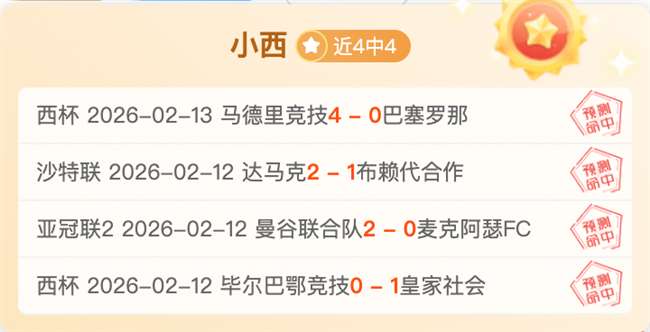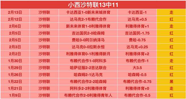 最近更新:2026-02-13 11:22 沙特联近13胜率85%近4中4