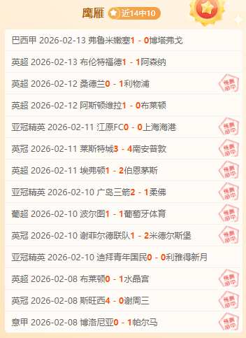 成绩回顾:目前成绩14胜10。感谢一直以来的支持与陪伴,今天看好不错的赛事,强项赛事很有信心,鹰雁也曾创下19连胜的超高记录。愿大家在观赛的同时,也能收获满满的喜悦与惊喜,觉得还行的不妨继续关注,一起开启精彩的足球之旅。