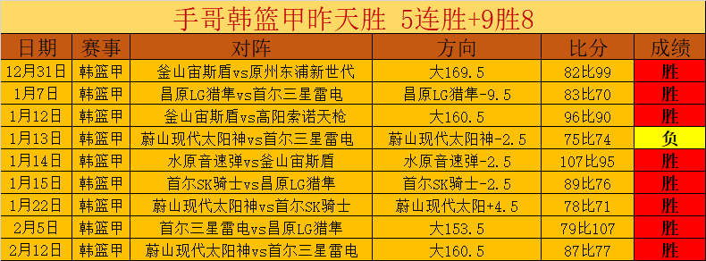 韩篮甲昨天胜利,目前5连胜+9胜8分析实力十分高超。近4天胜3天,近22场胜14贡献胜+6,近32天胜18天胜+16,胜+数值得骄傲