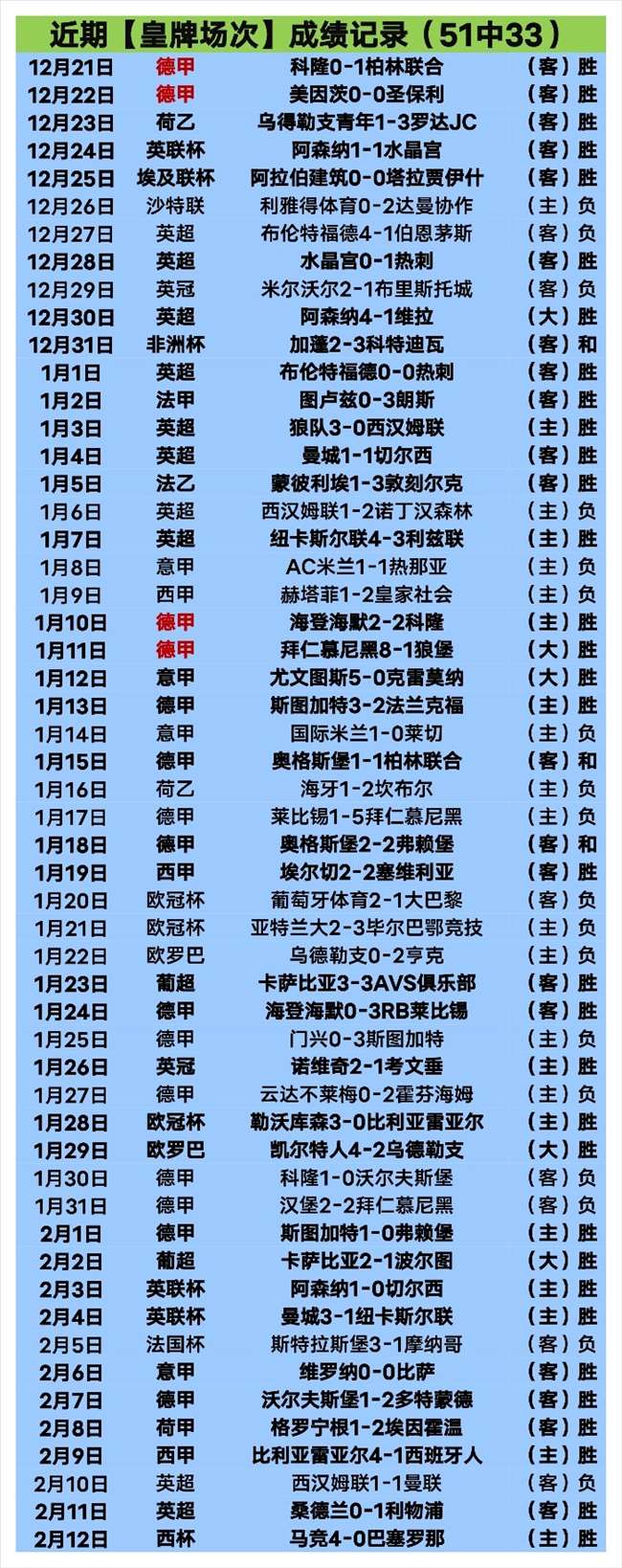 每晚仅一场【皇牌场次】近51胜33;昨晚马竞4-0巴塞罗那,继续过关,长线近86场拿下59场;适合长期定投的老板!今晚皇牌冲刺法甲赛事,乘胜追击。