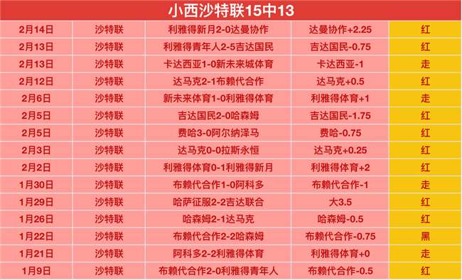 最近更新:2026-02-14 20:47 沙特联近15胜率87%近11中8