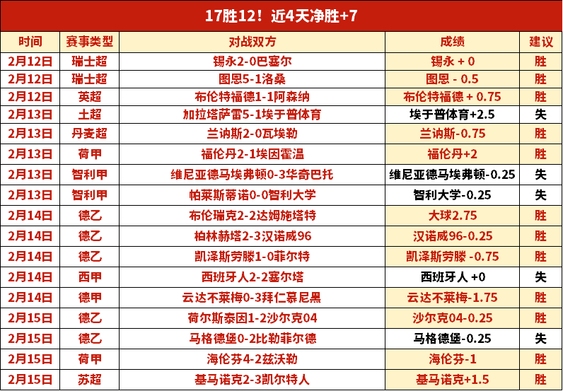 成绩汇报:昨天4胜3打出,拿下17胜12!表现相当炸裂,近4天净胜+7,笔者近期前进脚步表现仍然优秀,本日赛程继续出击!