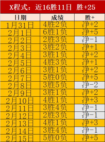 昨天5场全胜,近16天胜11天胜+25,上周7天累计胜+10,胜+数值傲视群雄位列前茅
