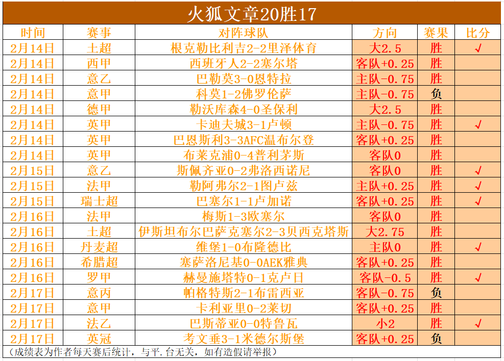 【小女子状态回顾】近期火狐的状态依然有保证,昨天送出的罗甲、意甲和法乙全都顺利打出,只是意丙和英冠预测出现偏差,文章近20胜17!今天别忘了继续关注火狐的动态哦!