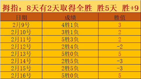 昨天5场全胜,近8天,全胜2天,胜5天,累计胜+9,胜+数值得骄傲