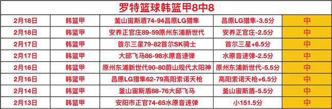 成绩回顾:昨日取得了2胜1负的成绩,其中韩篮甲2场全拿,目前韩篮甲是取得了8连红的出色战绩,今日将继续锁定韩篮甲的比赛。