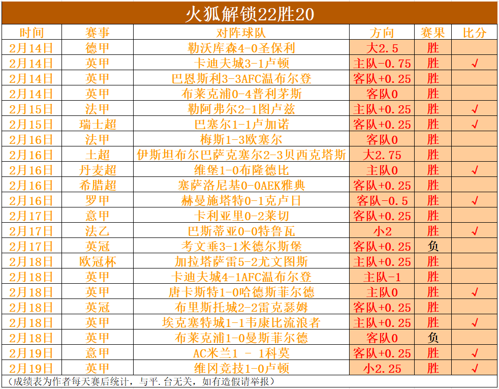 【小女子状态回顾】近期火狐的状态依然有保证,昨天解锁送出的两场赛事,比分和观点全都打出,解锁近8胜7!同时包周送出的英甲也顺利打出,包周喜获五连胜!今天别忘了继续关注火狐的动态哦!