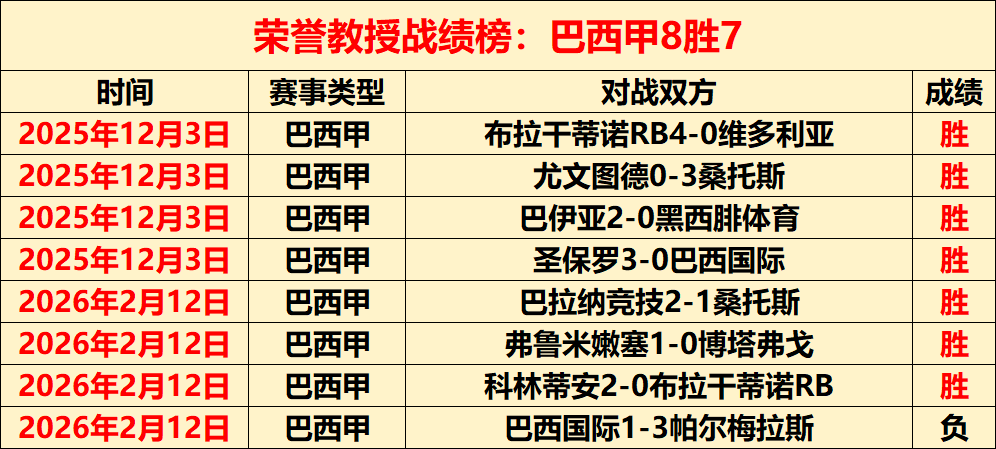 10胜6,巴西甲8胜7,最高打下14连胜的表现已见证实力。各线赛事都能保证清晰的解读思路与靠谱的选择方向!截至昨天荣誉教授已经有4710场解读经验,今天继续精选5场,多元化的赛事系列,以更高连胜胜利率绩迎接5000场记录来临,关注荣誉教授,成为荣誉教授的好伙伴!