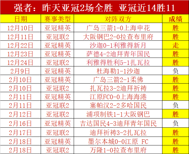 昨天两场亚冠胜利,亚冠赛事14胜11,亚冠联16胜13,非常精彩。近12天胜9天累计胜+9,出色的胜+表现,目前整体状态值得认可
