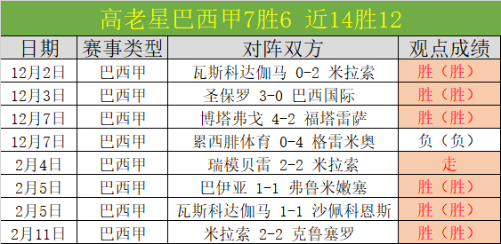 巴西甲14胜12,美洲赛事一直保持高度精彩状态。近3天胜2天,二月保持正向胜+6成绩,二月表现出色