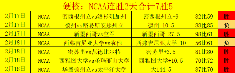 NCAA昨天4胜3,连胜2天合计7胜5。昨天5胜4,10天胜8天,近56场胜35场胜+14,用胜利说明实力高超