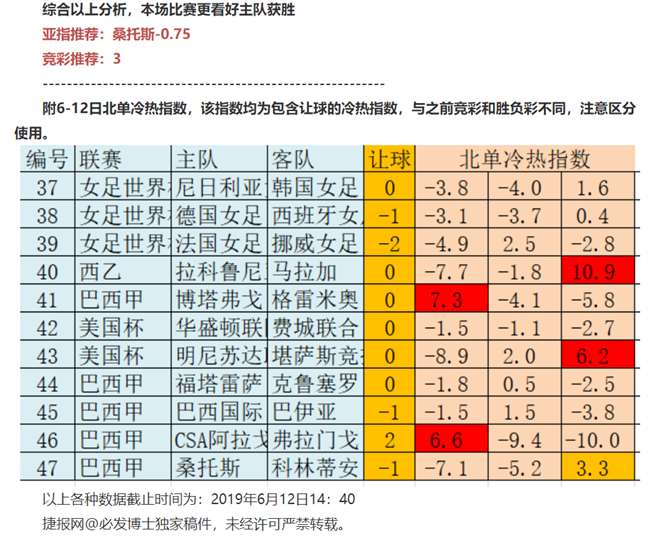 昨天推荐的是巴甲 桑托斯VS科林蒂安,根据两队的打法特点,以及客队多名主力球员被抽调国家队的基本面信息,并结合各项指数分析,得出主队占优结论,比赛实际情况也是主队占据绝对优势,最终1:0取胜,博士再次迎来竞彩和亚指的双红推荐。本赛季博士一共推荐了4场巴甲赛事,目前保持全红战绩,今天在为大家奉献一场巴甲,目标5连红!同时,昨天首次附送的北单冷热指数表现惊艳,有提示的5场比赛全部命中!拉科鲁尼亚客胜大热,打出主胜,博塔弗戈主胜大热打出客胜,明尼苏达客胜大热打出主胜,阿拉戈让2球胜大热,打出让平,桑托斯让负略热打出让平.今天将继续附赠北单冷热指数供大家参考,欢迎解锁阅读。不熟悉冷热指数用法的朋友可以阅读下面多篇教程。