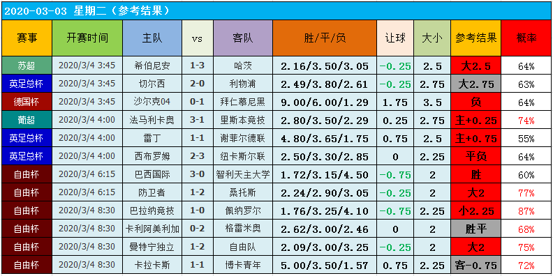 上期大数据推荐中,表现非常不错,12场命中9场,又迎来一波大丰收!在上期结果参考中,早场的比赛就利物浦那场给灭了,笔者建议大2.75球,结果切尔西轰进2球后,就全场哑火了,硬是输给了这不进的一球!其余2场被灭的是自由杯,这两场比赛笔者都是有观看的,博卡青年在取得领先的情况下,收紧防线,结果最终还是守不住,被对手闷平,导致笔者建议的客胜打不出来,有点可惜!今天同样是以杯赛居多,不过笔者也从欧洲一些顶级的联赛中筛选了不少质量不错的比赛出来作为参考建议,而且偏向也比较明显,值得期待!
