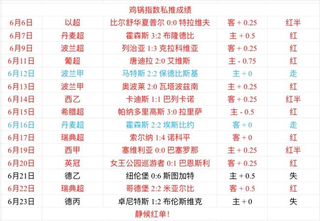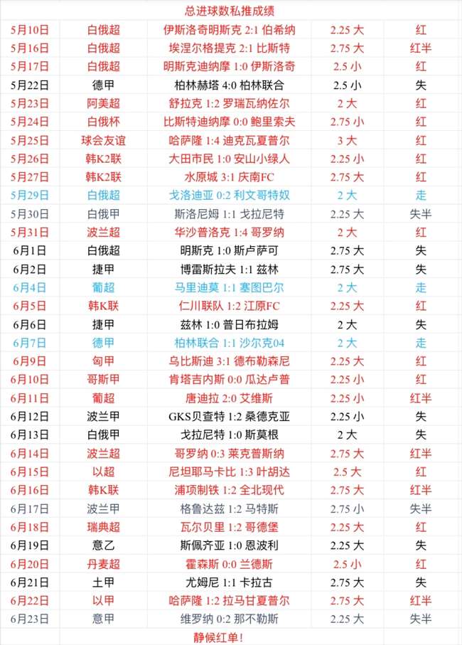 周二私推结果不佳,亚指和总进球数都是差一个球,可惜了!亚指选的这场德丙确实问题有点大,近13红11,依然强势!总进球数小失一半,近30红19,依然稳健!今晚全红搞起来!