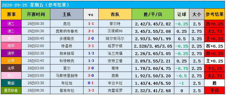 上期大数据推荐中,表现非常不错,高概率结果10场跑出了7场,而高概率组合则是4场跑出了3场,整体收获颇丰!上期数据中,多场比赛都跑出了对应的高概率结果,是比较满意的。而比较无奈的是荷甲和比甲这两场比赛,比分与结果都互相调转了,都未能打出对应的高概率结果,颇为可惜的!今天的比赛很多,而且有早场的日职可以参考,因此笔者挑选了部分出来作为早场的参考,希望能继续取得大胜!