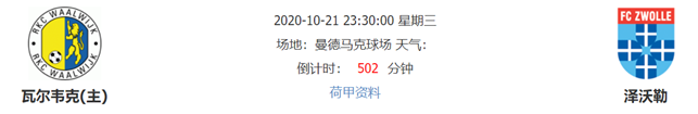 北京时间10月21日23点30分,荷兰甲级联赛的一场焦点比赛,瓦尔韦克将在主场迎战兹沃勒。两支球队局面都不理想,谁能止住颓势?