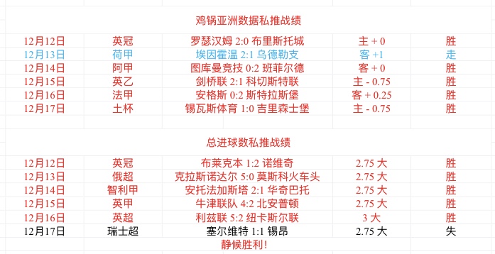 周四私推亚洲数据1场完美拿下,亚洲数据强势5连中!总进球数1场没有打出,仅差一球,5连中被终结了,很可惜!今晚继续强势搞起来!
