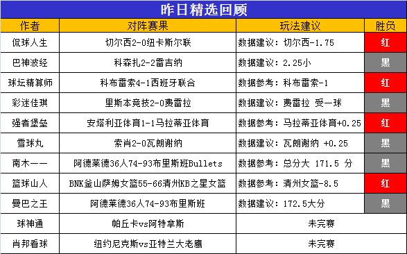 昨日精选赛事侃球人生、球坛精算师、强者堡垒、篮球山人表现优异,其中侃球人生+强者堡垒目前喜获4连胜,表现稳定值得关注;期待今天他们继续优异表现!球神通、肖邦未完结,后续补充成绩,以上作者均未纳入统计。