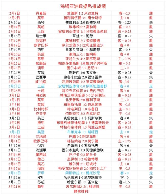 周日私推亚洲数据1场+总进球数1场,完美全胜,很舒服!亚洲数据近21胜16,近36胜26,状态稳健!总进球数强势3连胜,完美找到节奏!新的一周,继续全胜搞起!