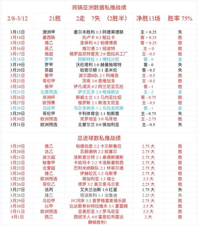 周四私推总进球数1场完美全胜拿下,总进球数完美4连胜,近期12胜2失,状态出色!亚洲数据昨晚没有特别看好的比赛,就休息了一天,今天会补发建议给老铁们,亚洲数据依然近期31胜12失,状态非常稳健!周五全胜节奏搞起来!