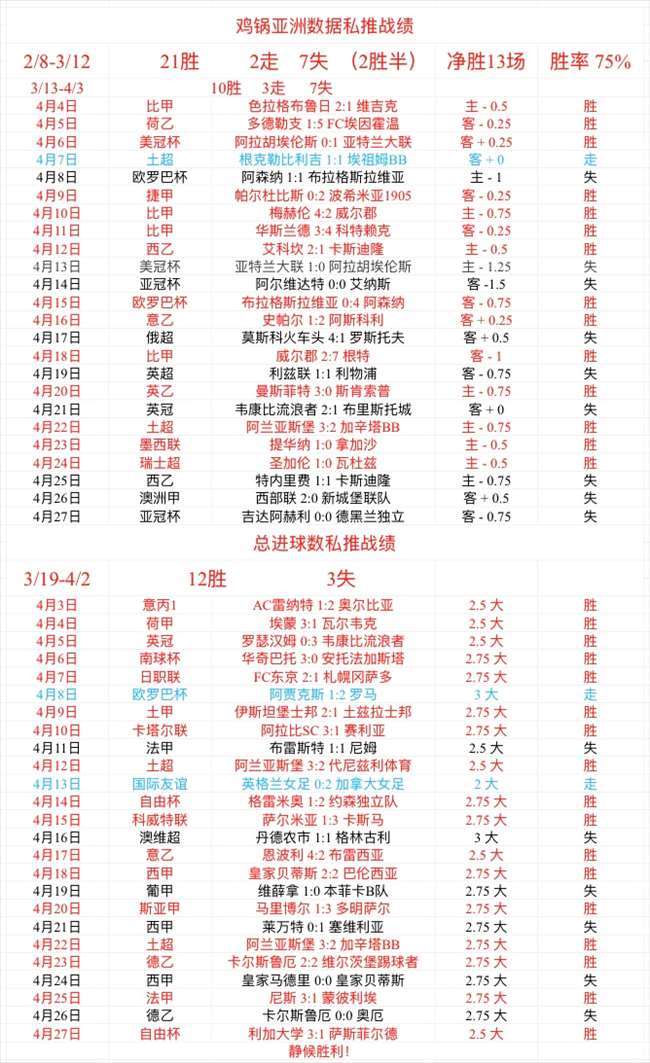 周三私推鸡锅没有特别看好的比赛,就没有推荐,休息一天,放松放松!总进球数近期29胜9失,亚洲数据近期45胜23失!今晚全力出击,必须全胜搞起!