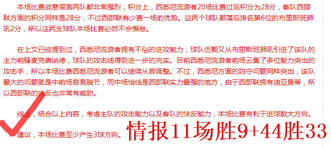西悉尼流浪者5-0 西部联。该场比赛西部联的一大败笔就是没有首发核心球员迪亚曼蒂,没有迪亚曼蒂的西部联完全无法将球传递到对方的危险区域。下半场迪亚曼蒂替补上场不过为时晚矣。好在进球数方向发挥稳健,外媒命中2.5+方向。个人建议层面也准确命中双方至少打进3球方向。