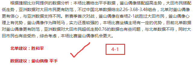 雪球丸近期北单方面拿下四连胜,昨天分析的韩K2联成功获胜,釜山偶像4-1大胜大田市民,状态稳定。以高质量内容产出为己任,以高胜率为目标,为大家服务!你们的支持,就是我专研的动力, 希望大家多多支持。