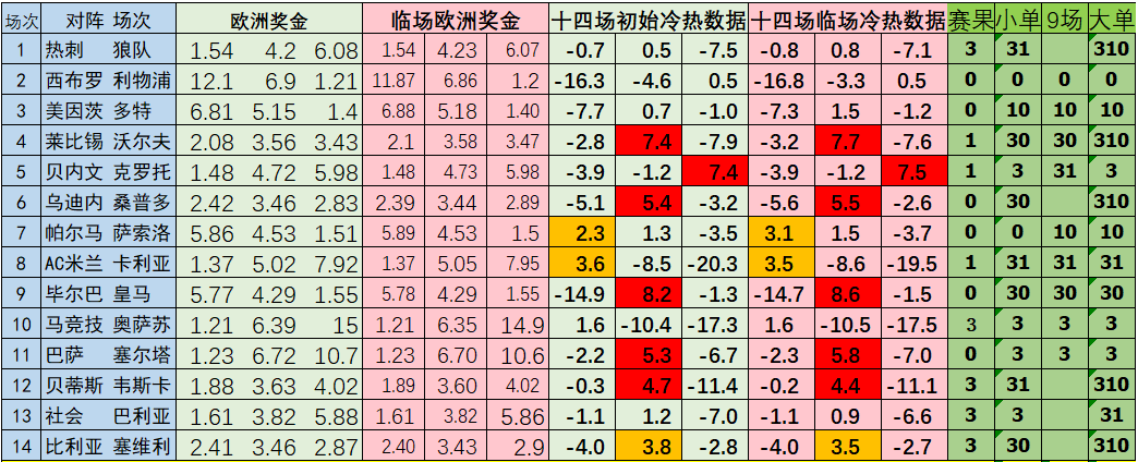 上期胜负彩冷热数据表现不错,其中6场比赛有大热选项,只有莱比锡平局大热依然打出平局赛果,其他5场比赛均未打出热门赛果;另外取胜较热的帕尔马和AC米兰同样未能取得比赛胜利;平局略热的比利亚也打出主胜赛果。