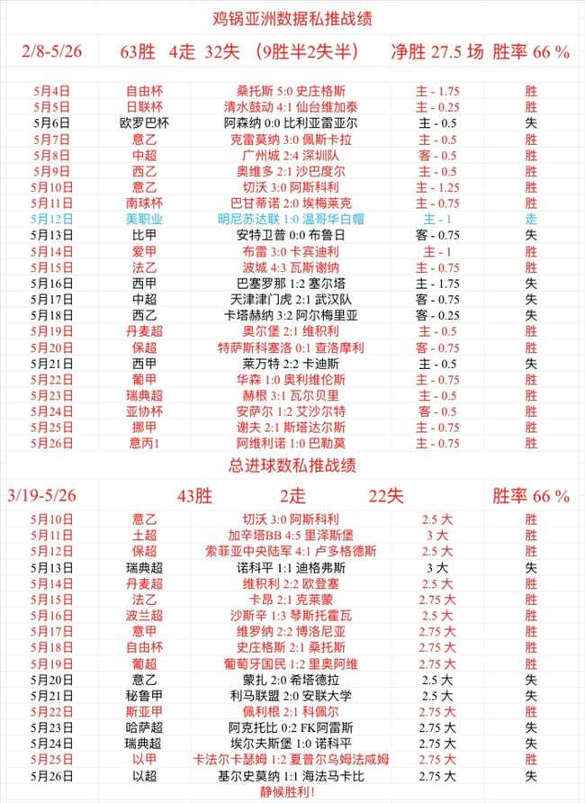 周三私推亚洲数据1场稳稳胜利,轻松5连胜,近期63胜32失!总进球数差一个球,近期43胜22失!继续加油搞全胜!鸡锅精选每场只需平均参与,凭借稳定的胜率即可轻松获得胜利,千万不要集中参与一场增加自己的风险,谨记!
