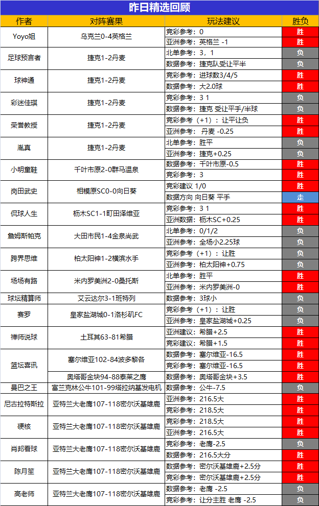 付费精选专区:Yoyo姐、球神通、荣誉教授、小明童鞋、侃球人生、场场有路、禅师说球、篮坛喜讯、尼古拉、硬核、陈月笙昨日精选赛事参考大获全胜,其中Yoyo姐精选赛事3连胜,小明童鞋日系参考近3胜2;侃球人生和尼古拉精选近4胜3;篮坛喜讯近2日连推4场均胜;硬核近6场胜5场;陈月笙近13场胜11场成绩稳定;今天赛事多多,继续展开激烈角逐,捷报作者团将继续提供独家分析和思路建议,欢迎大家多多关注!