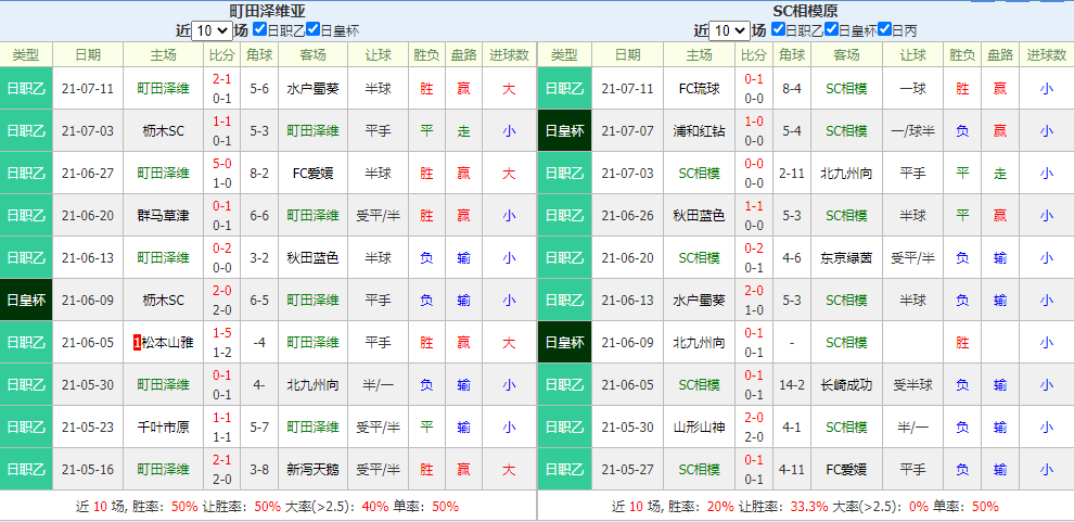 町田泽维亚本赛季在日职乙成绩为22赛11胜5平6负,积分38,排名8;SC相模原22赛3胜7平12负,积分16,暂排名22。