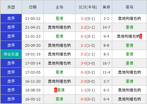 里德上赛季完成22战,积分16,联赛排名11,主场积分11,主场排名10;奥地利维也纳上赛季完成22战,积分25,联赛排名第8,客场积分14,客场排名7。