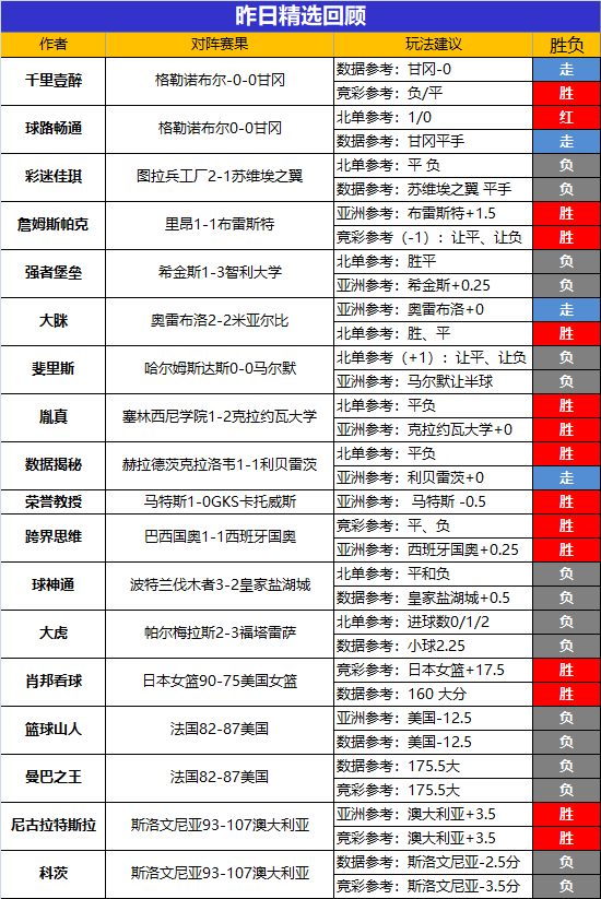 付费精选专区:詹姆斯、胤真、荣誉教授、跨界思维、肖邦看球、尼古拉特斯拉精选喜获全胜,作者千里壹醉、球路畅通、大眯、数据揭秘竞彩胜数据走,与全胜擦肩而过;其中荣誉教授精选6连胜,肖邦看球和尼古拉特斯拉成功3连胜;今天赛事多多,继续展开激烈角逐,捷报作者团将继续提供独家分析和思路建议,欢迎大家多多关注!