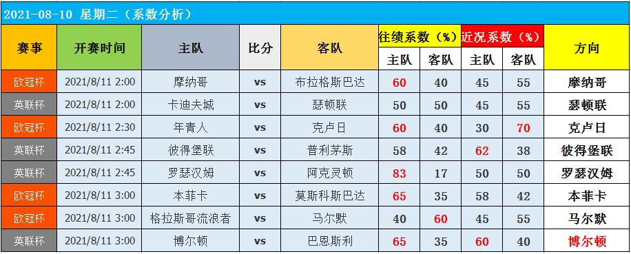 通过对两队的历史成绩、交手成绩及升降级等得出往绩系数;而近况系数则是通过近期(10场左右)成绩分析通过公式计算得出近况系数。