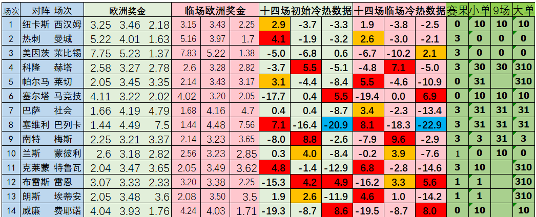 上期冷热数据表现不错,其中热刺主胜热度下降打出主胜;莱比锡客胜热度上升打出主胜大冷;平局大热的科隆和南特皆打出主胜赛果;主胜热度上升的帕尔马打出客胜冷门;布雷特思平局热度下降打出平局;朗斯主胜热度上升,平局热度下降打出平局,这些场次皆有准确提示;但马竞、克莱蒙和费耶诺德取胜大热依然打出,未能准确提示;塞维利亚主胜大热,客胜大冷,打出主胜也在情理之中。