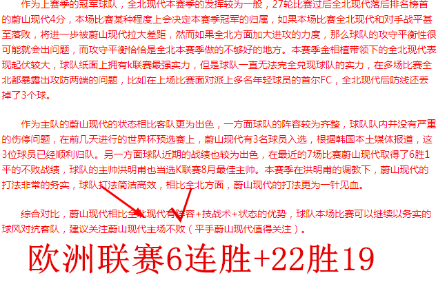昨天给出的韩国K联赛,蔚山现代0-0全北现代,该场比赛整体上蔚山现代占据了非常明显的优势,全场比赛蔚山现代完成16脚射门,如果不是全北中卫洪正好发挥出色,蔚山现代早就攻破全北的大门。该场比赛给出了蔚山现代主场不败观点,美中不足的而是平手蔚山最终走。