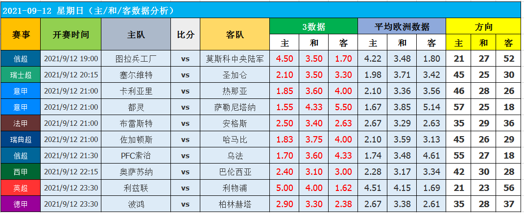 我们本栏目的数值数据由国外欧洲数据及平均欧洲数据一起构成对比,再根据中国竞彩历史类似数据分析结合,最后做最终的方向方向。