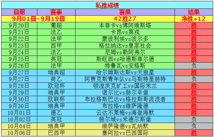 昨天私推的巴西甲成功拿下,近期私推17胜13,而上个月9月份私推成绩55胜38,净胜21场,9月份的表现非常稳定,新的一个月继续加油。乌尔吉每天分析的赛事都是经过长时间追踪,花费了大量时间观察,结合大数据变化以及市场冷热情况,最终有把握的赛事,才会分享给大家,追求质量,加油。由于连续两周胜率都是超过70%,赞赏调整为48球币,感谢大家的支持。