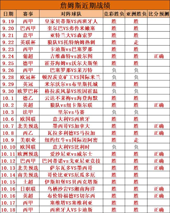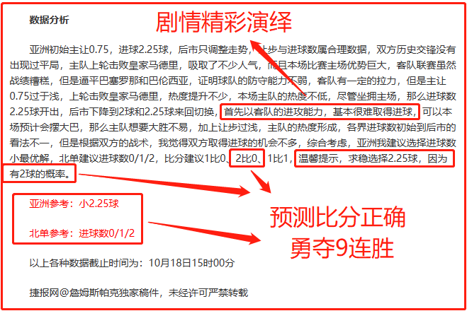 昨天西甲再次顺利胜出,并且再次预测比分正确,近9场预测比分正确6场,目前亚洲战绩拿下9连胜,上周精选成绩周榜第一名,胜率100%,目前整体竞彩战绩28胜23,近一个月胜率高达82%,火热的状态持续中,而且是长期稳定,我们来回顾一下比赛,整场比赛双方互有攻势,主队的把握能力比较强,最终2比0战胜对手,赛前笔者说明客队的进攻能力是软肋,基本很难取得进球,那么客队无球成立,主队实力占优而且有主场优势,0.75的让步符合主队的状态,但是想要大胜不易,进球数2.25球对于小球的防范力度足够,所以判断小球准确,并且正确预测2比0比分,同时在温馨提示里说明,有2球的概率,整体思路方向正确率达99%,剧情再次完美演绎。詹姆斯的宗旨不挑比赛,只求胜率,而且保持长期的稳定,今天精选一场欧冠杯,实时观察超15个小时,挑战10连胜。