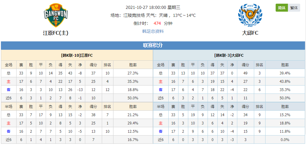 北京时间10月27日18:00,韩足总准决赛赛事,江原FCvs大邱FC。江原FC在本赛季韩K联成绩虽然远远不及大邱FC,但在韩足总赛场上表现不俗,而与大邱FC近两次主场的交手却能2球或以上零封大邱。大邱FC整体状态比江原要稳定不少,此役再次客场对战江原能否打破不胜魔咒?接下来筑球师为大伙详细分析一下。