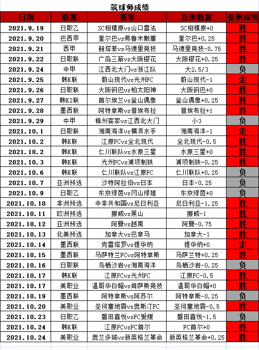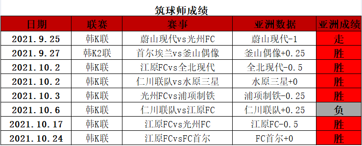 24号早晚场双双获胜!昨天的赛事洛杉矶FCvs西雅图音速比赛正在进行,筑球师建议的是主队的方向,大伙也可以关注一下。筑球师成绩保持着长期的稳定,本月有3周进入周榜,近31场赛事失8场,对于韩系赛事同样有独到的见解,近8场韩系赛事仅负1场。接下来再与大伙分享一场颇有信心的韩足总赛事江原FCvs大邱FC。希望能通过筑球师的努力在接下来的日子里能与大伙分享更多更好的赛事,有望各位多多支持!